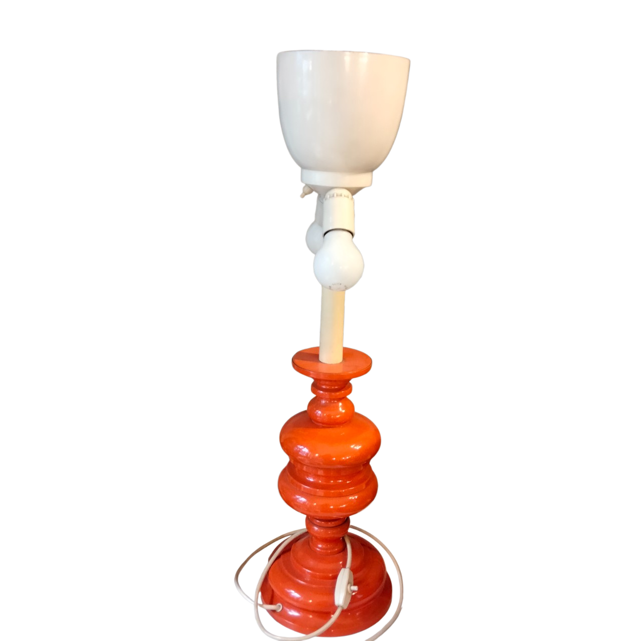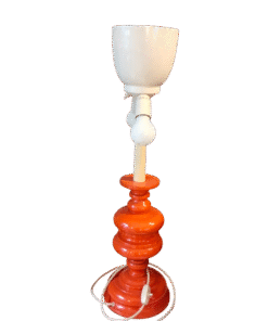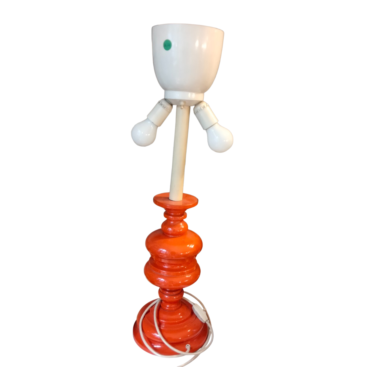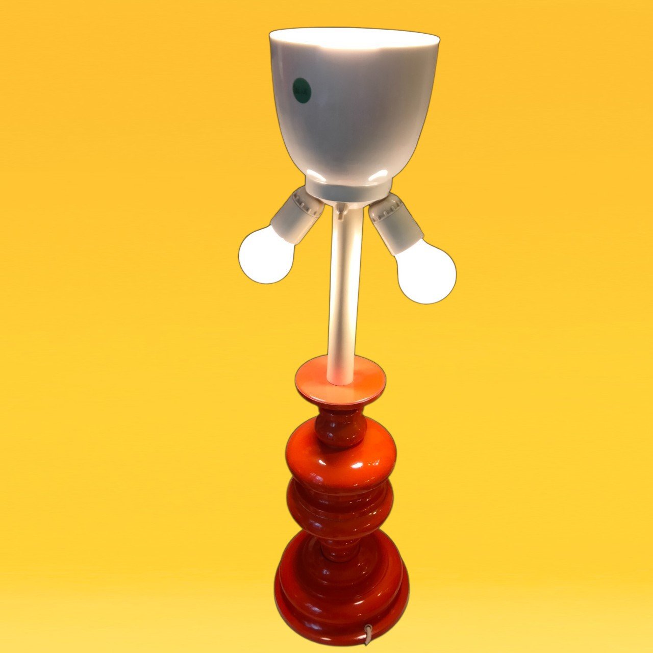 Base in plastica arancione e reggi lampada in metallo.