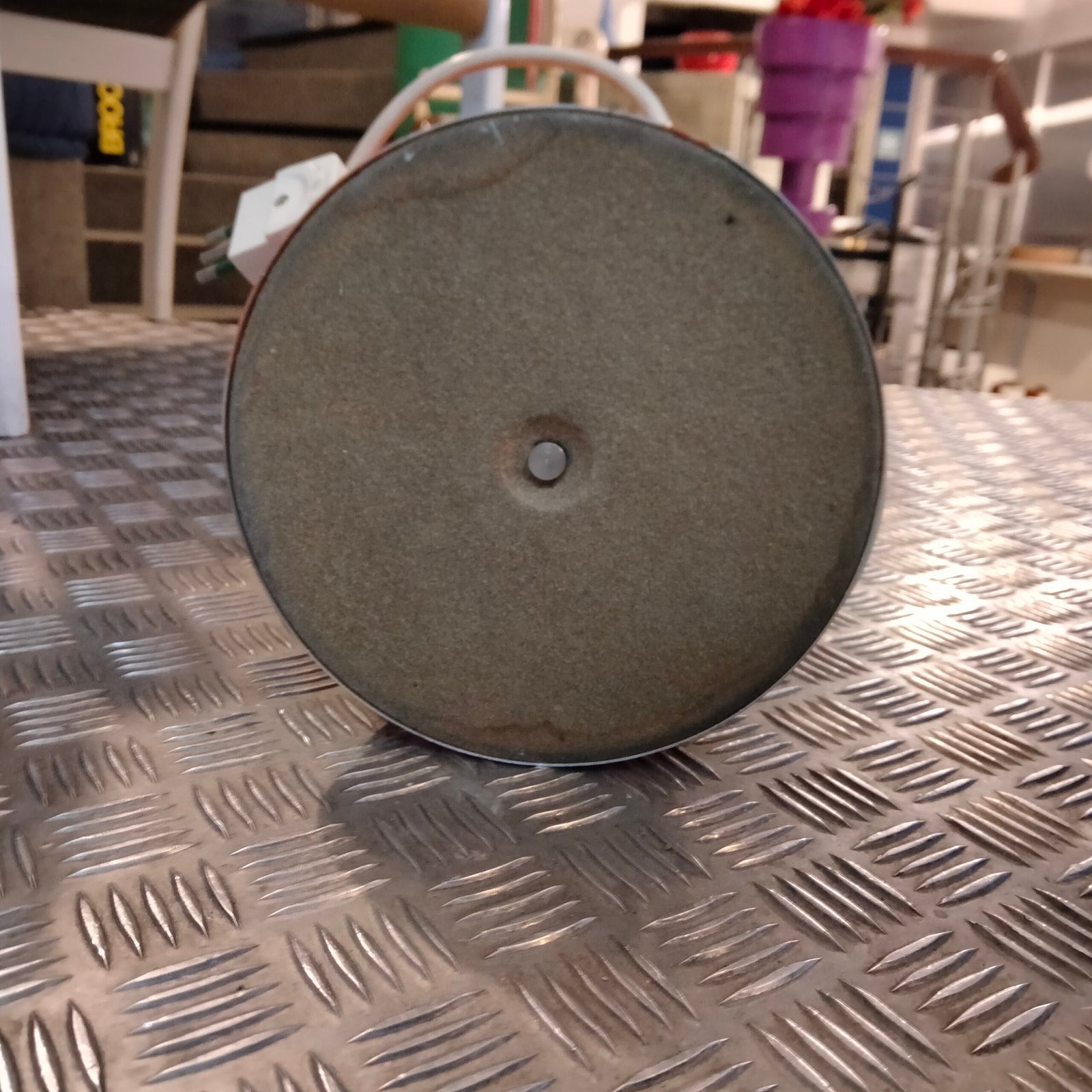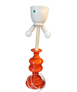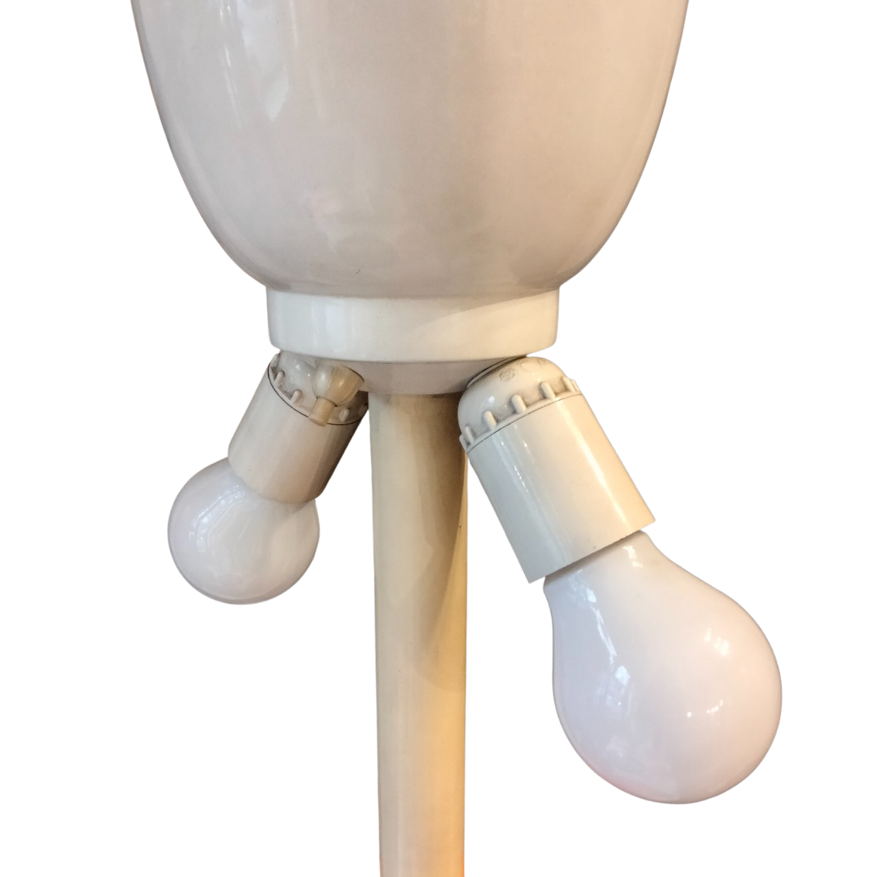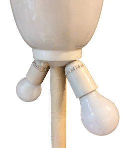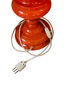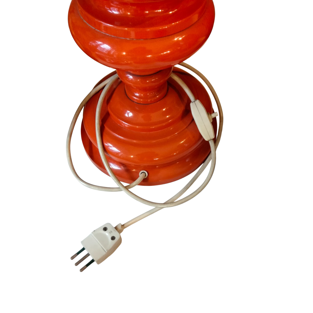 Base in plastica arancione e reggi lampada in metallo.